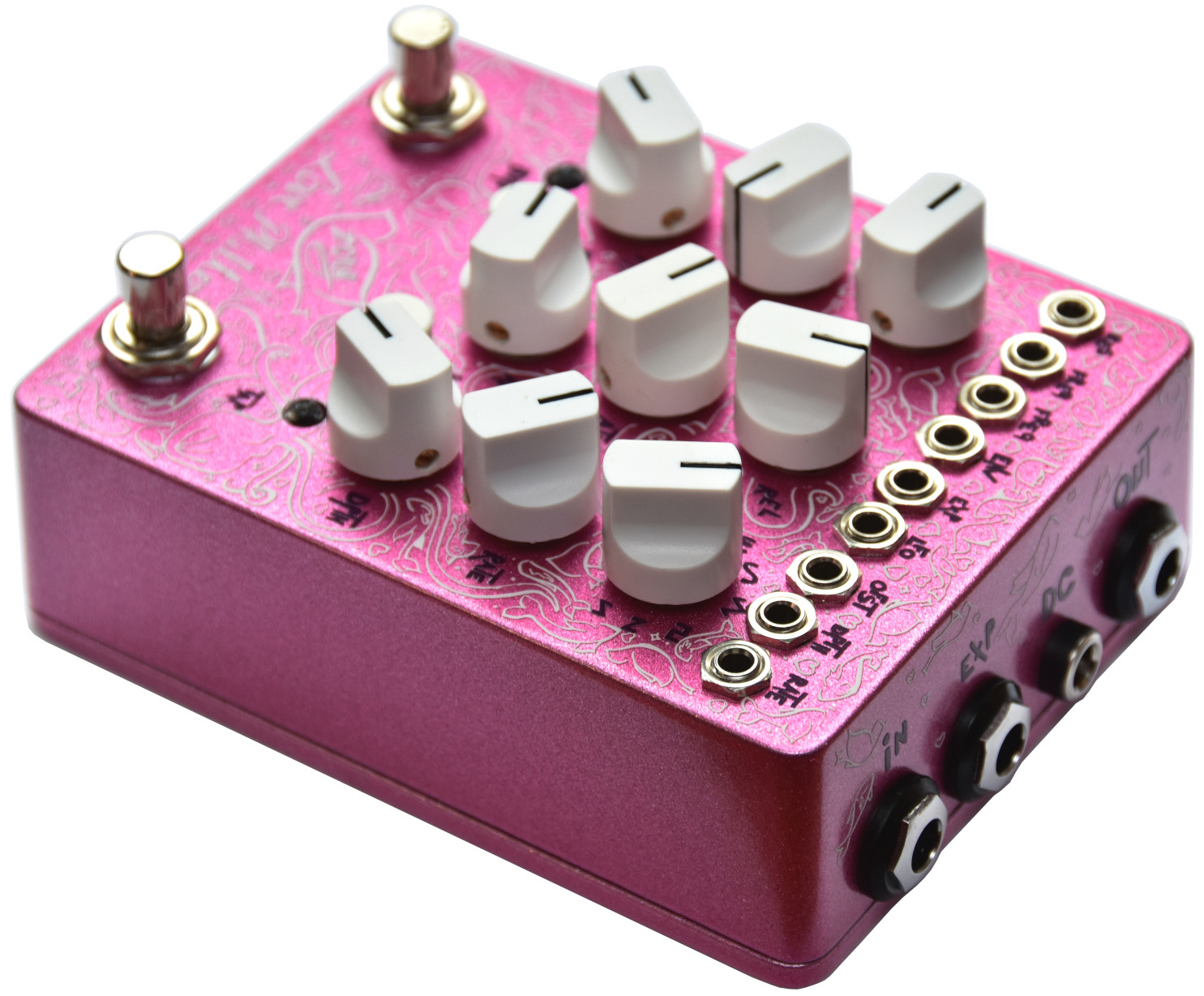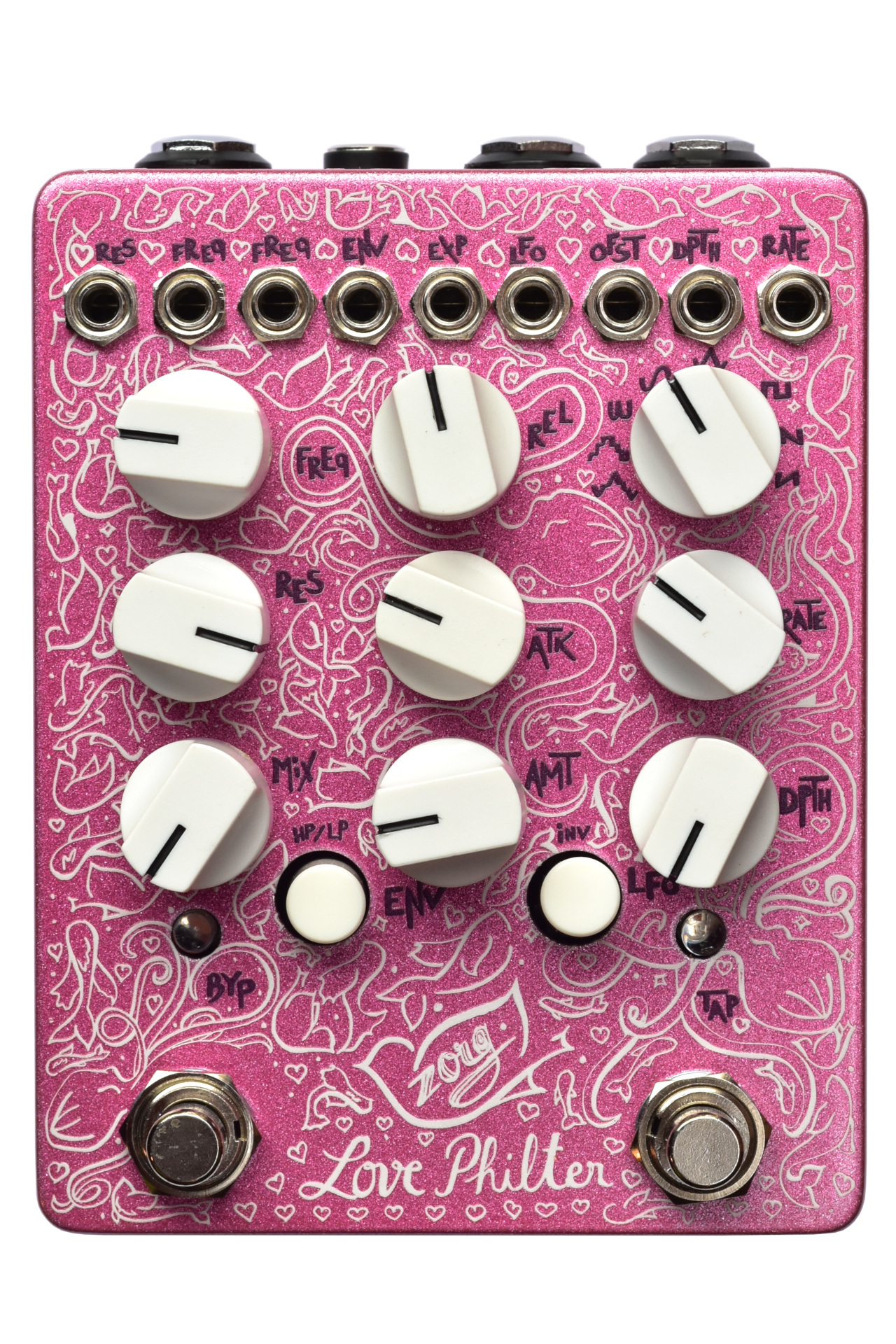 Série limitée 10é anniversaire Disponible début mars 2026! Pour le 10é anniversaire de Zorg Effects j'ai travaillé avec des artistes pour faire des designs en série limitée. Chaque pédale est livrée avec une impression A4 encadrée du dessin. Le design de cette Love Philter MKII a été réalisée par la luthière toulousaine Marine Pacaut. Seules 5 pédales numérotées seront disponibles. Un filtre résonnant modulaire ultra complet! Il y a quelques années, une marque nommée Moog proposait une gamme de pédales d’effets très sympa avec un son inégalé, des entrées/sorties en control voltage et une grosse capacité créative. Je fûs très déçu quand en 2018 ils annoncèrent l’arrèt de la production, et la plupart des musiciens le furent encore plus lorsque les prix sur le marché de l’occasion explosèrent. Ce Love Philter MKII est ma première pédale pour recréer la joie de jouer avec des pédales qui peuvent s’interfacer via des CV et la capacité créatrice d’une interface fourmiliant de paramètres. Cette pédale contient trois « modules » séparés. Tout d’abord elle contient un filtre résonnant qui peut être un passe haut ou un passe bas, basé sur un puce qui était utilisée dans les synthétiseurs Oberheim des années 80. Ce filtre d’excellente qualité a une bande passante constante et une résonnance qui reste contenue lorsqu’on balaie le spectre vers les aigus. Le filtre peut auto-osciller, soit en une sinusoïde pure au début de l’oscillation, soit en onde carrée quand la résonnance est poussée au maximum. Ensuite la pédale contient un module d’enveloppe complet avec des contrôles d’attaque, release et de polarité. Et enfin un module de LFO est disponible avec 8 formes d’ondes dont la fréquence peut être changée par potentiomètre ou via un tap tempo. Enfin, neuf entrées/sorties CV et une entrée pour pédale d’expression permettent de contrôler quasiement tous les paramètres de la pédale et d’utiliser la pédale non seulement en auto-wha, ou envelope filter, mais aussi comme wha-wha, ahw-ahw, auto-ahw, filtre passe haut ou passe bas fixe et résonannt, mais aussi une sorte de phaser à deux étages, un VC0, un pistolet laser, etc. Enfin la pédale peut être utilisée avec une basse, une guitare, des synthétiseurs, ou autres. Les CV permettent de l’interfacer avec des synthétiseurs analogiques ou des mooger-foogers... |